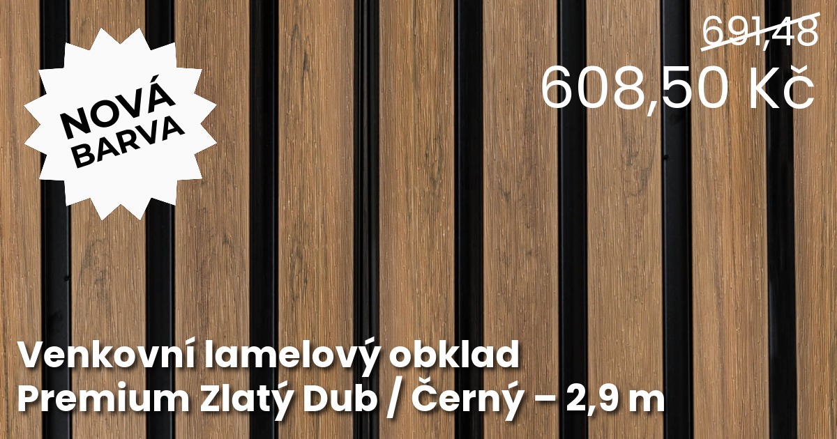 Během Black Week najdete v akci různé barvy a varianty – včetně NOVINKY: Zlatý Dub / Černá, která zaujme kontrastním spojením lamel v odstínu zlatého duba a hluboké černě v pozadí, čímž vytváří efekt stylové, moderní fasády.