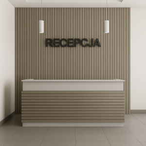 Tato vizualizace představuje elegantní a moderní recepci, kde hrají hlavní roli dekorativní lamely v barvě Dub Sonoma. Výsledek? Prostor působí lehce, svěže a profesionálně. Horizontální uspořádání lamel na čele recepčního pultu se harmonicky doplňuje s vertikálními lamelami na stěně a vytváří jednotnou, estetickou kompozici. Ideální řešení pro místa, která chtějí udělat dobrý první dojem – kanceláře, ordinace, hotely či kliniky, kde je důležitá funkčnost i stylový vzhled prostoru.