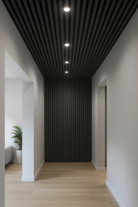 V chodbě, zejména s větší výškou, působí velmi efektně grafitové lamely instalované na stěně i stropě. Tmavý odstín a rytmické uspořádání svislých pruhů dodávají interiéru hloubku a eleganci. Grafit se ideálně hodí ke světlým stěnám a přírodním podlahám – vytváří moderní kontrast, který prostoru dodává jedinečný charakter. Skvělé řešení, pokud chcete zvýraznit vstup do domu nebo přechodovou zónu bez zbytečných dekorací.