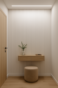 Předsíň s lamelami v barvě Bílý Satén získává výjimečnou svěžest a jemnost. Světlý saténový povrch lamel odráží světlo, opticky zvětšuje prostor a činí interiér světlejším a příjemnějším. Toto provedení se dobře kombinuje se světlým dřevem a béžovými doplňky a vytváří elegantní, minimalistický vstup do bytu či domu. Ideální volba pro milovníky klasické bílé v moderním pojetí.