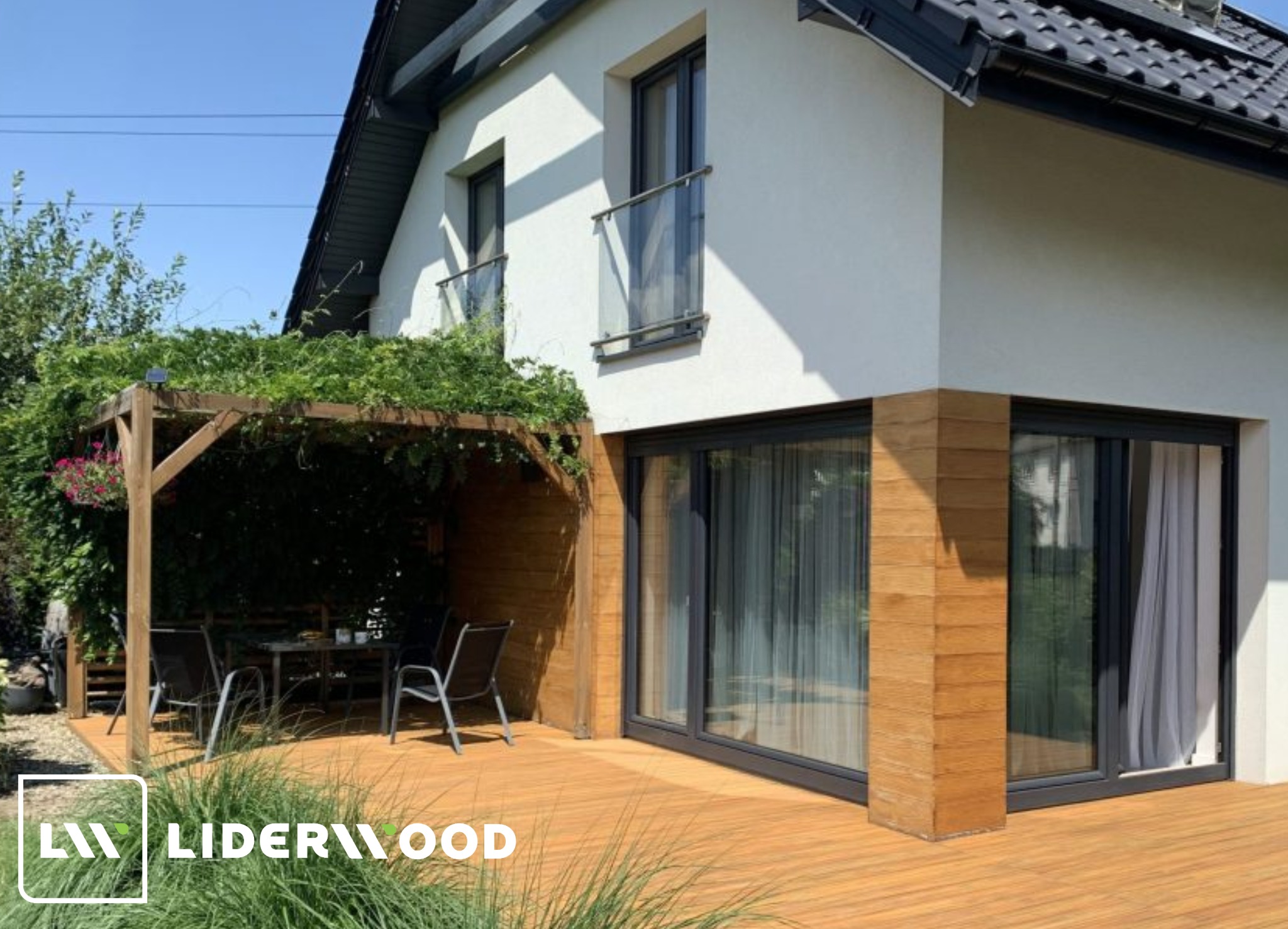 Vizuální sladění – siroká nabídka barev a povrchových úprav prken Liderwood umožňuje snadno vytvořit harmonický celek s téměř jakýmkoli typem zastřešení. Bez ohledu na to, zda se jedná o hliníkovou, dřevěnou nebo polykarbonátovou konstrukci – vždy dosáhnete jednotného a estetického vzhledu.