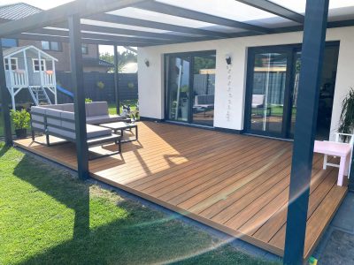 Zastřešená terasa s prkny Liderwood je zárukou jednotného, elegantního vzhledu – od podlahy až po střechu. Kompozitní úprava WPC se perfektně hodí k moderním typům zastřešení, jako jsou pergoly nebo hliníkové konstrukce.