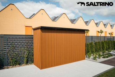 Kombinace kontrastních barev dodává prostoru charakter a zároveň podtrhuje jeho moderní styl. Jak prkna, tak lamely se vyznačují odolností vůči povětrnostním vlivům, což činí toto řešení nejen estetickým, ale také praktickým.