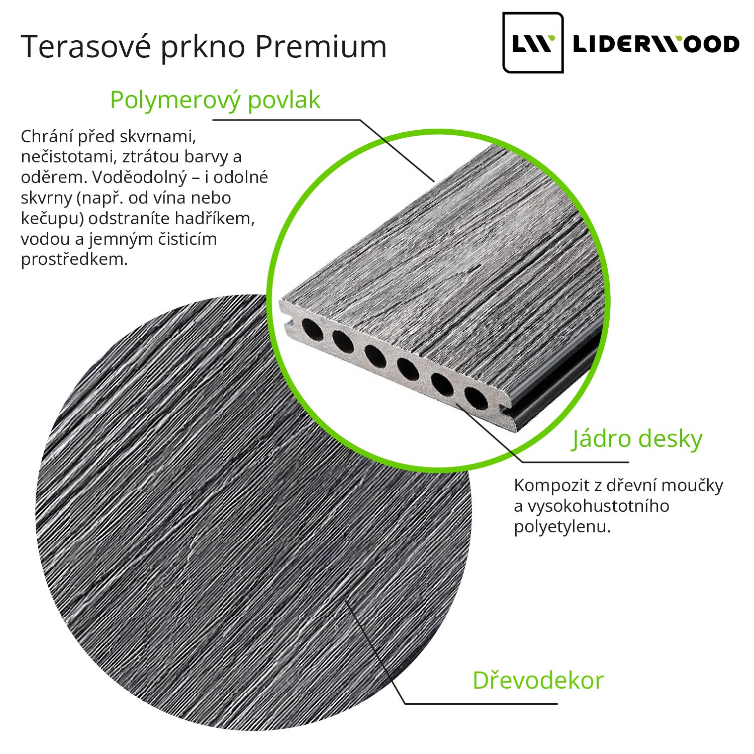 Kompozitní terasové prkno Premium II. generace spojuje výjimečnou kvalitu s moderním designem. Díky pokročilé technologii výroby má prkno charakteristickou strukturu připomínající přirozenou kresbu dřeva. Terasová prkna Premium jsou oboustranná a dvoubarevná – každá strana má jiný odstín.