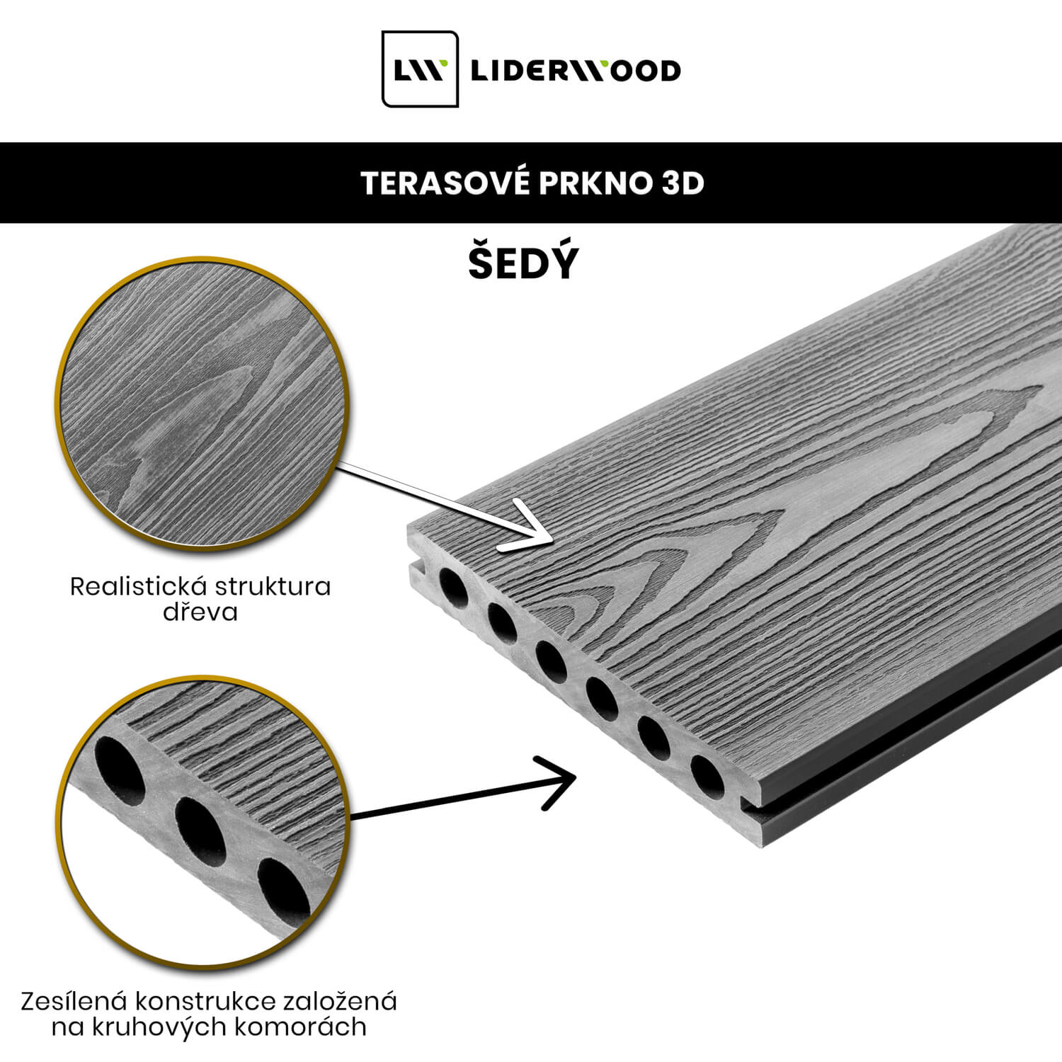 3D prkno spojuje elegantní vzhled s praktickým přístupem k úpravě terasy. Díky oboustrannému provedení si můžete vzhled přizpůsobit podle preferencí – volbou mezi přirozeným embosováním a jemným drážkováním. Zesílená konstrukce a kvalitní kompozit zajišťují odolnost vůči vlhkosti, hnilobě, UV záření i působení hmyzu.